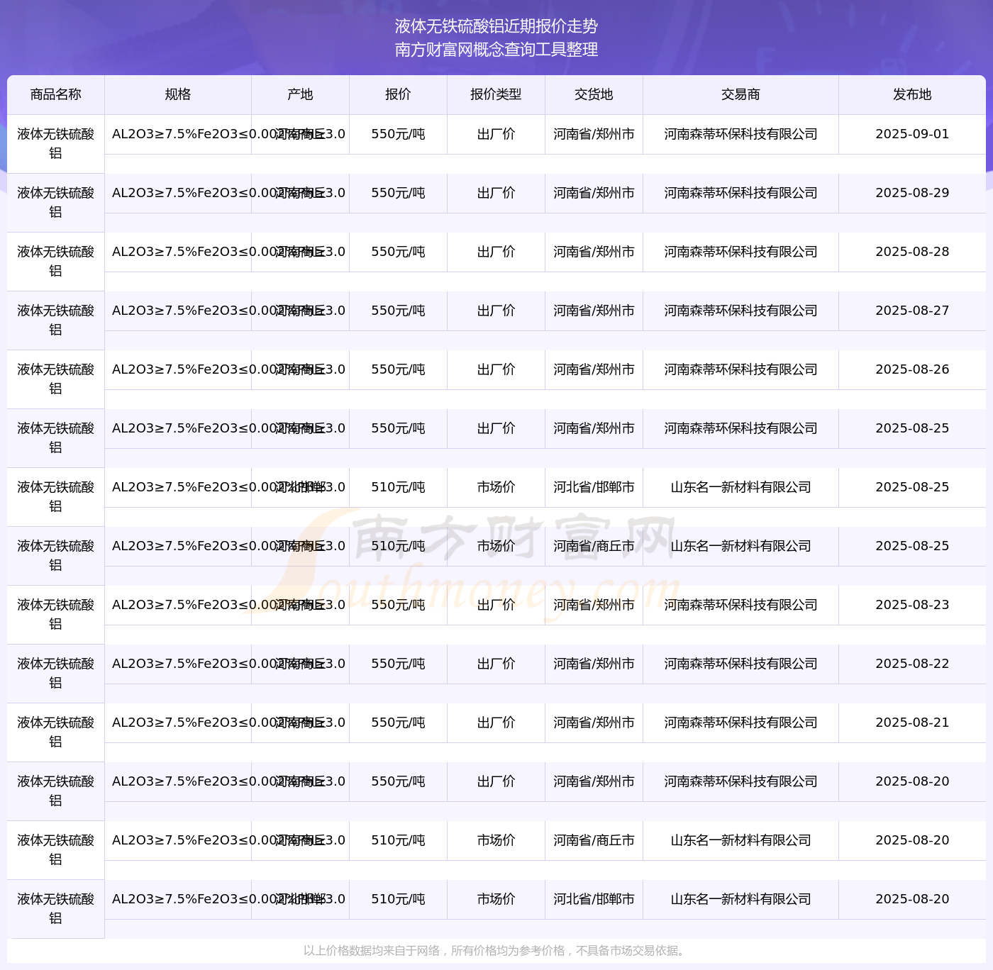 2025年9月1日液體無鐵硫酸鋁最新價格