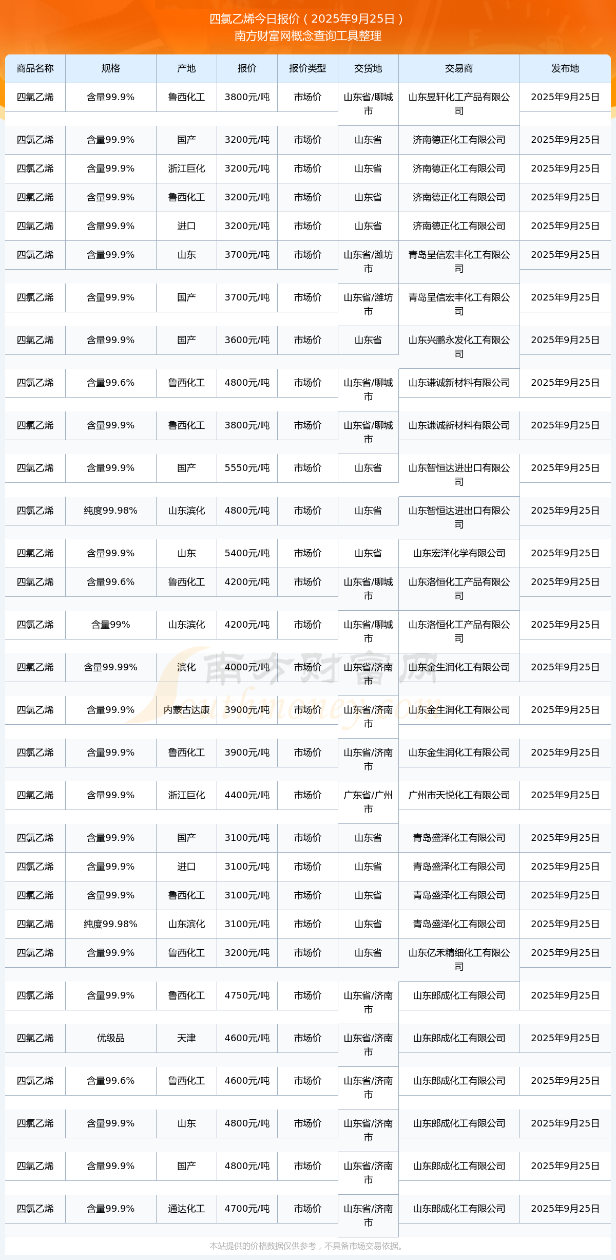2025年9月25日,四氯乙烯(含量99.9%)價(jià)格為3800.00元/噸,報(bào)價(jià)人:山東昱軒化工產(chǎn)品有限公司,交易地點(diǎn)為山東省/聊城市。