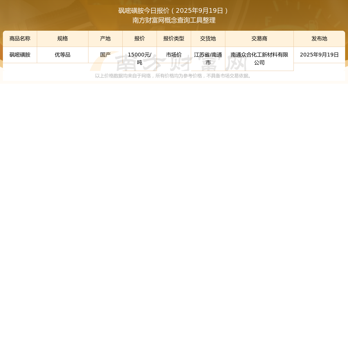 2025年9月19日,南通眾合化工新材料有限公司砜嘧磺胺(優(yōu)等品),國(guó)產(chǎn),交易地點(diǎn)為江蘇省/南通市,市場(chǎng)價(jià)報(bào)價(jià)為15000.00元/噸。
