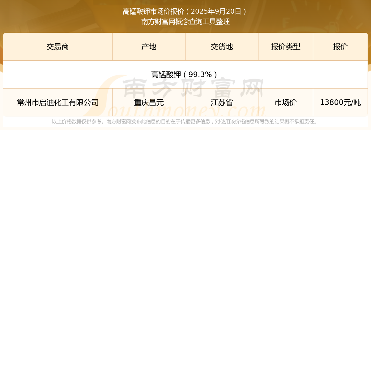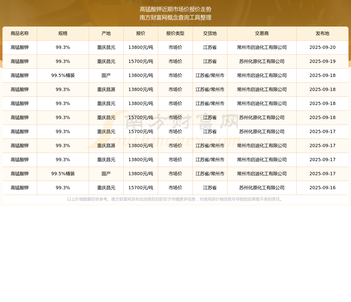 2025年9月20日,常州市啟迪化工有限公司高錳酸鉀(99.3%),重慶昌元,交易地點(diǎn)為江蘇省,市場(chǎng)價(jià)報(bào)價(jià)為13800.00元/噸。