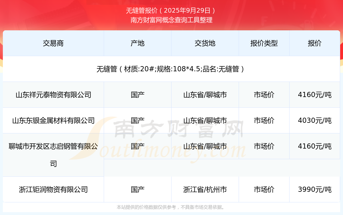 2025年9月29日,山東祥元泰物資有限公司無縫管(材質(zhì):20#;規(guī)格:108*4.5;品名:無縫管),國產(chǎn),交易地點(diǎn)為山東省/聊城市,報(bào)價為4160.00元/噸。