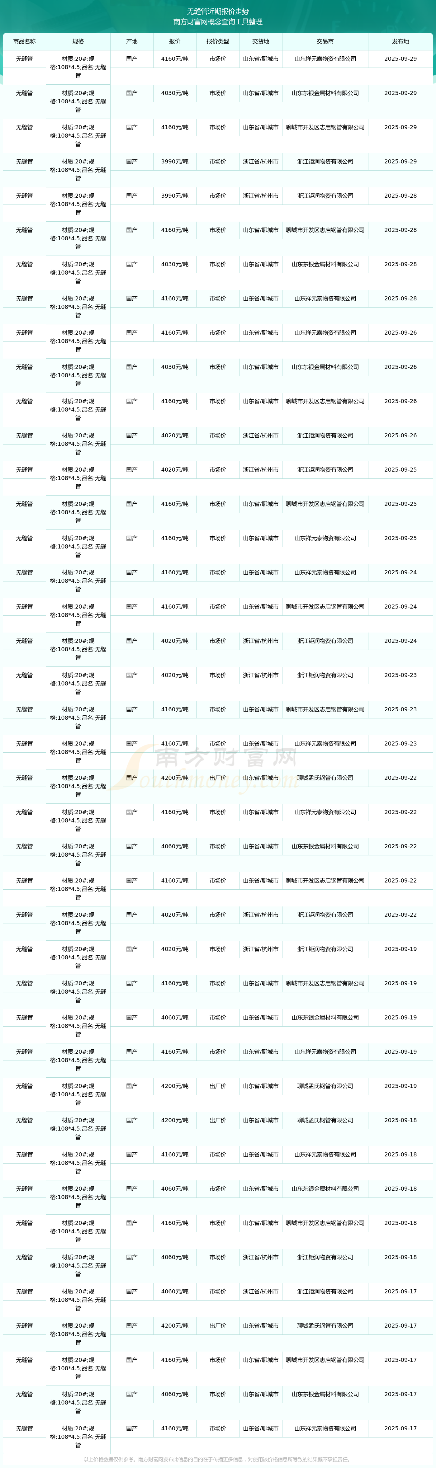 2025年9月29日無縫管報(bào)價詳情及近期報(bào)價走勢