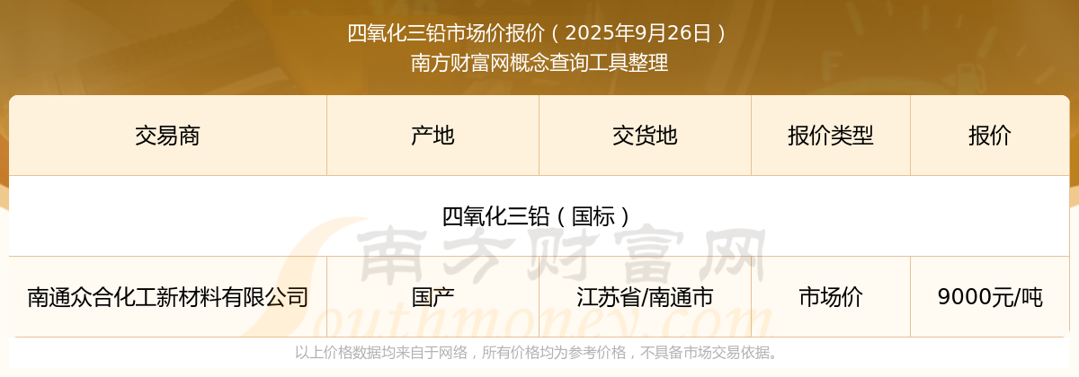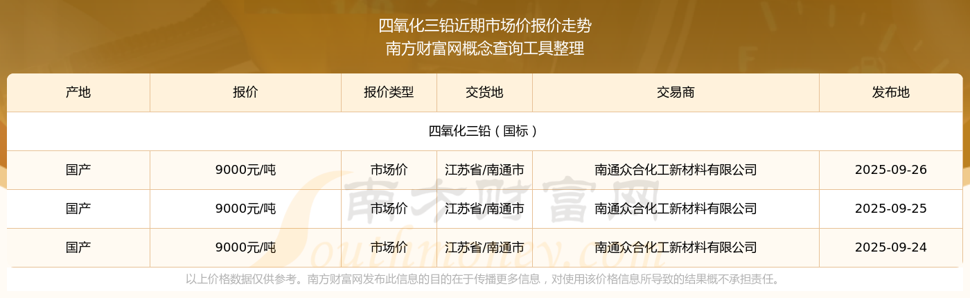 2025年9月26日,四氧化三鉛(國標)市場價價格為9000.00元/噸,報價人:南通眾合化工新材料有限公司,交易地點為江蘇省/南通市。