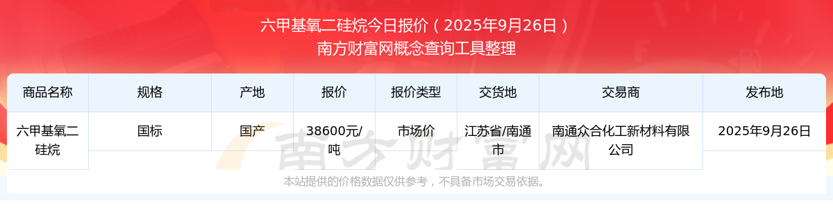 2025年9月26日,南通眾合化工新材料有限公司六甲基氧二硅烷(國標(biāo)),國產(chǎn),交易地點(diǎn)為江蘇省/南通市,市場價報價為38600.00元/噸。