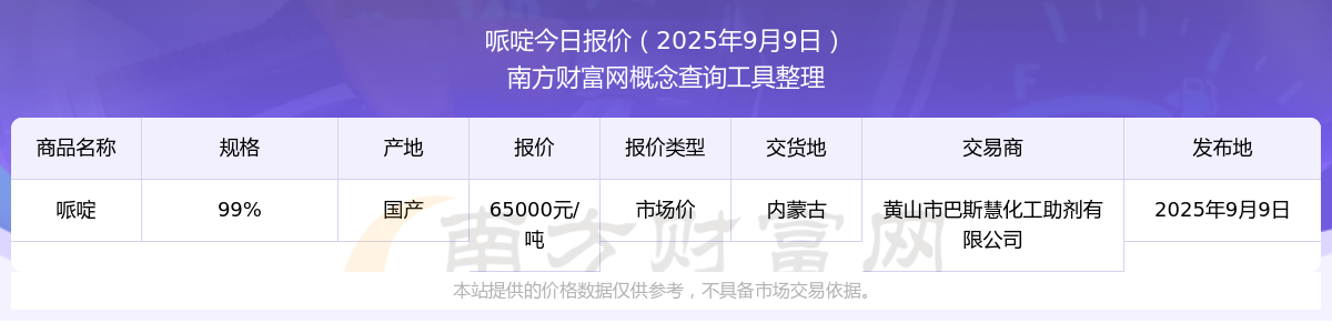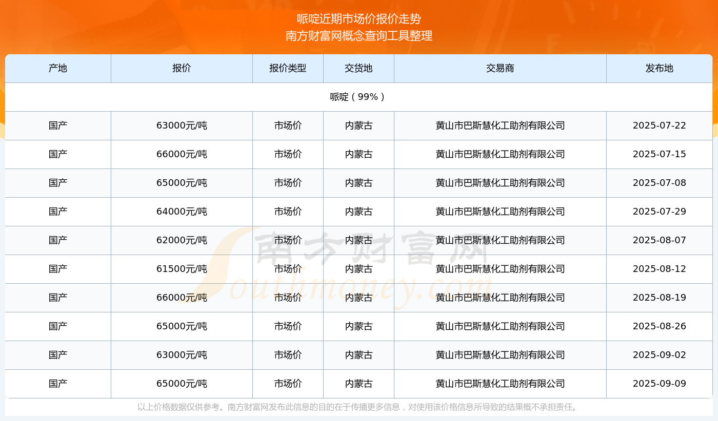 2025年9月9日,黃山市巴斯慧化工助劑有限公司哌啶(99%),國產(chǎn),交易地點為內(nèi)蒙古,市場價報價為65000.00元/噸。