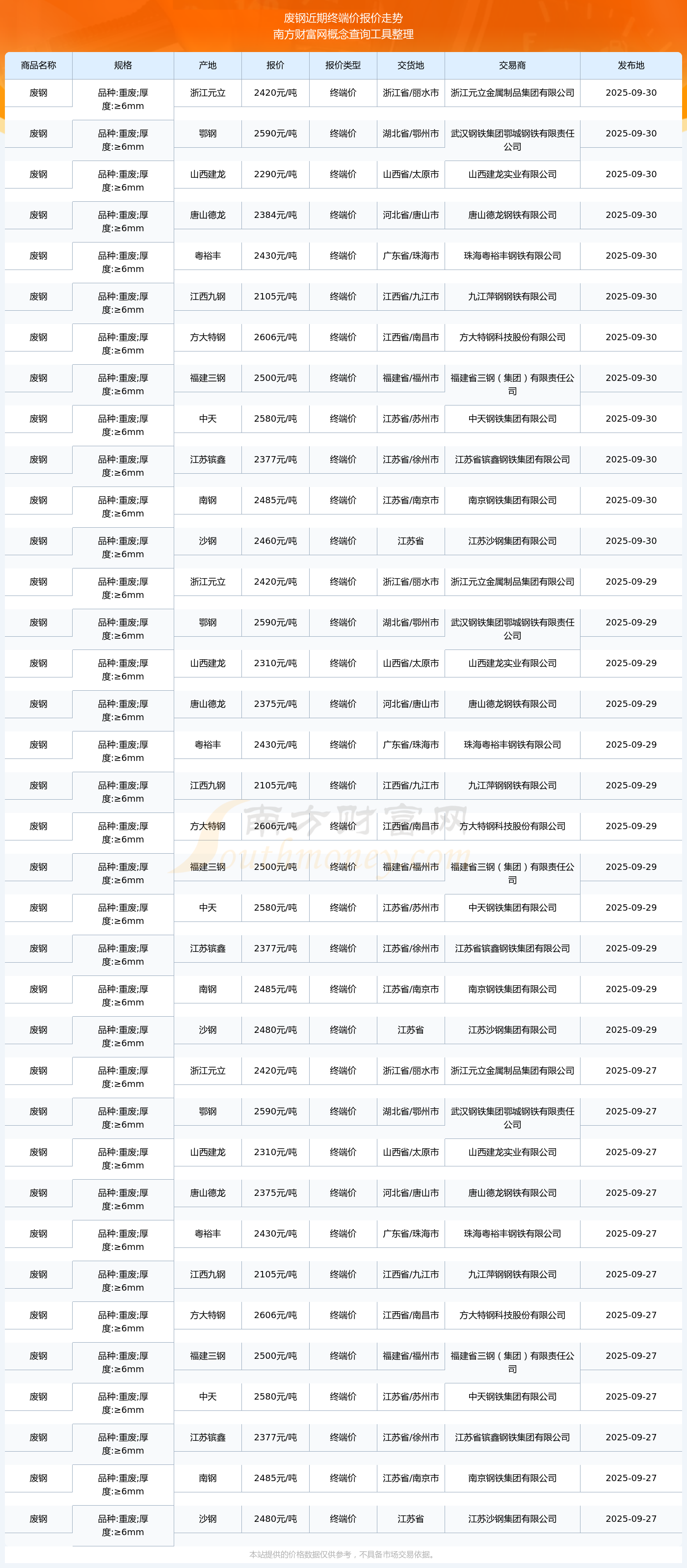 廢鋼終端價(jià)報(bào)價(jià)行情(2025年9月30日)