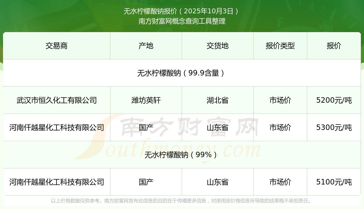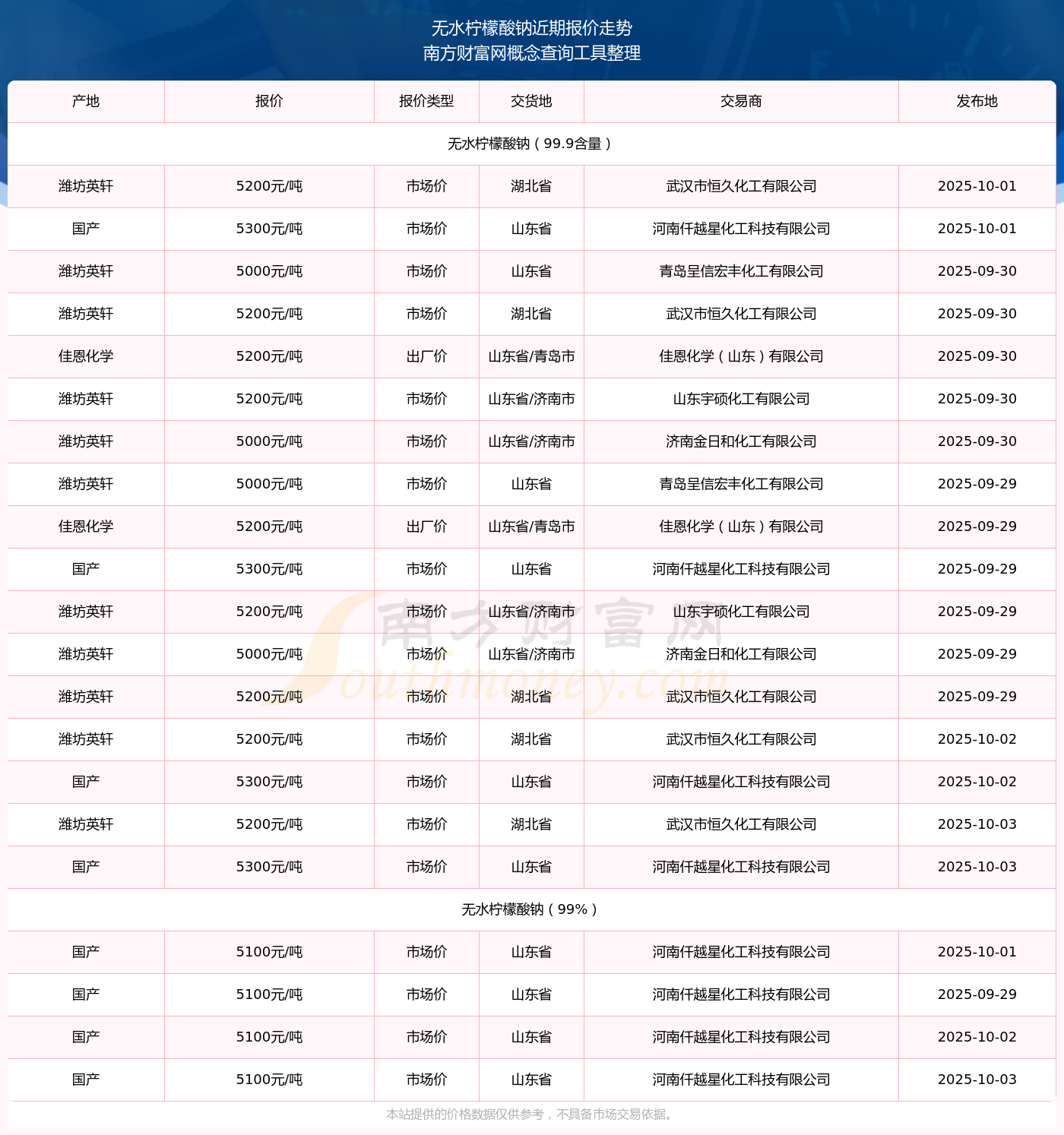 無(wú)水檸檬酸鈉報(bào)價(jià)查詢(2025年10月3日)