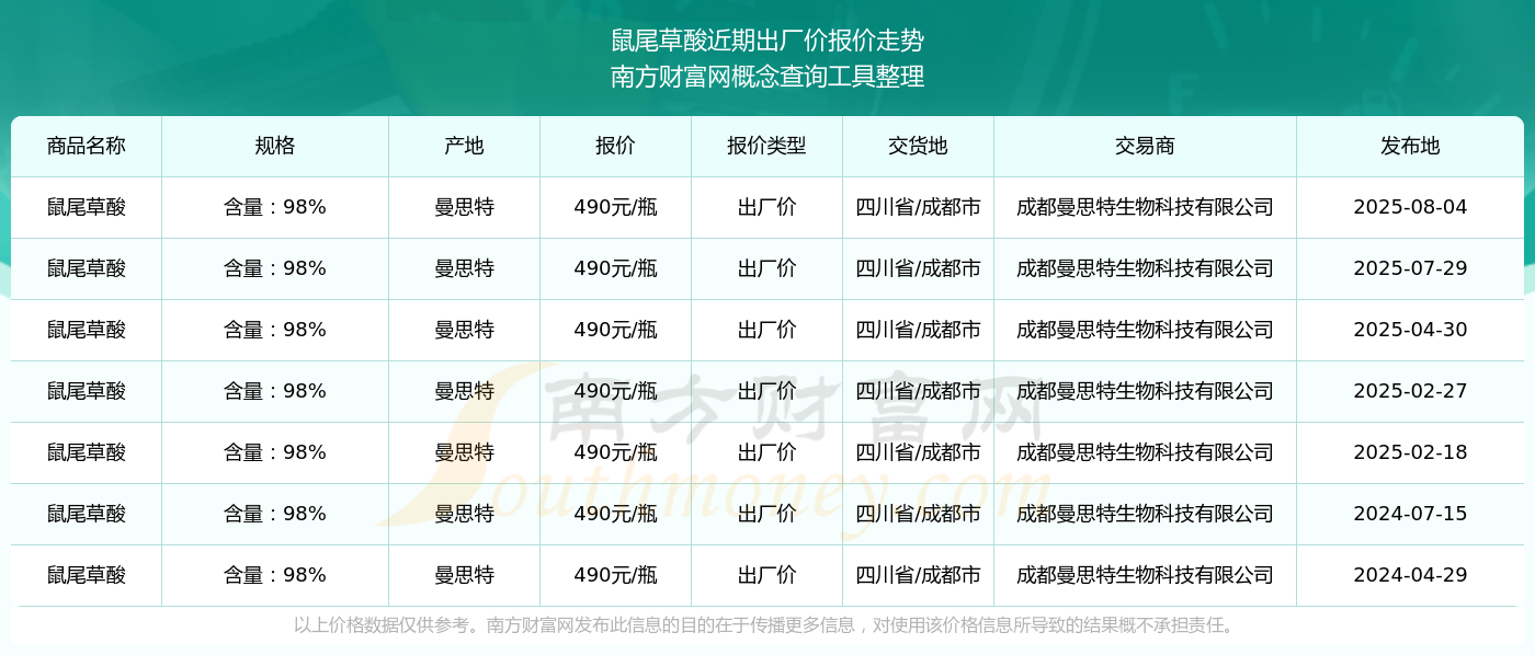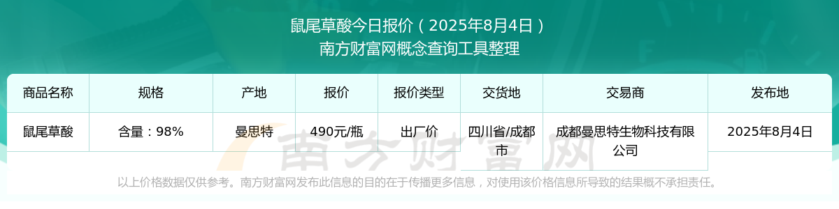 2025年8月4日,鼠尾草酸(含量:98%)出廠價價格為490.00元/瓶,報價人:成都曼思特生物科技有限公司,交易地點(diǎn)為四川省/成都市。
