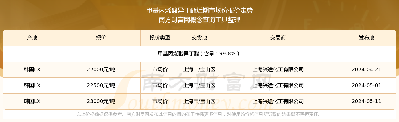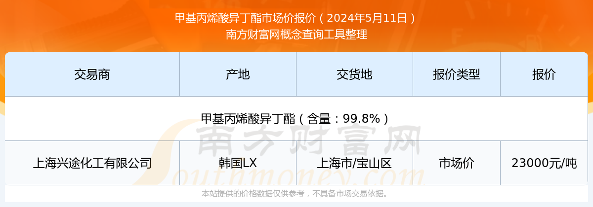 2024年5月11日,甲基丙烯酸異丁酯(含量:99.8%)市場(chǎng)價(jià)價(jià)格為23000.00元/噸,報(bào)價(jià)人:上海興途化工有限公司,交易地點(diǎn)為上海市/寶山區(qū)。