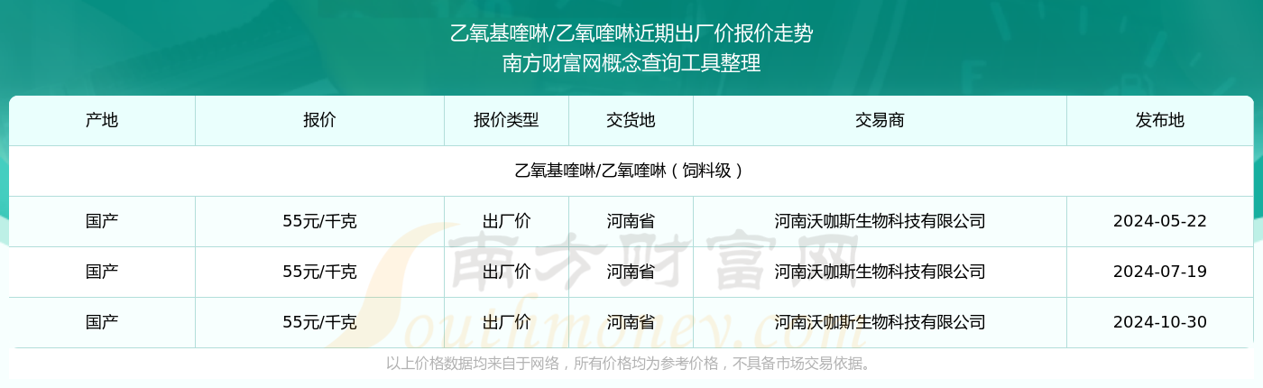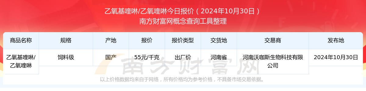 2024年10月30日,乙氧基喹啉/乙氧喹啉(飼料級)出廠價價格為55.00元/千克,報(bào)價人:河南沃咖斯生物科技有限公司,交易地點(diǎn)為河南省。