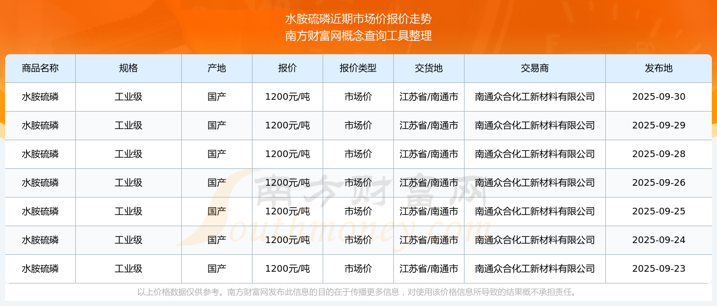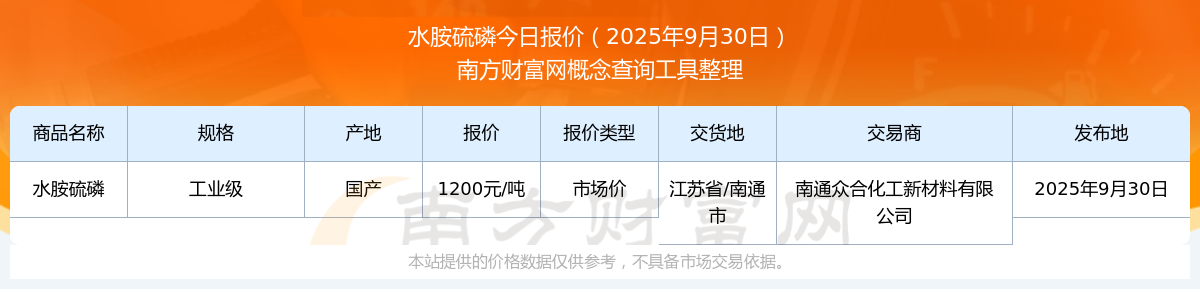 2025年9月30日,水胺硫磷(工業(yè)級(jí))市場價(jià)價(jià)格為1200.00元/噸,報(bào)價(jià)人:南通眾合化工新材料有限公司,交易地點(diǎn)為江蘇省/南通市。