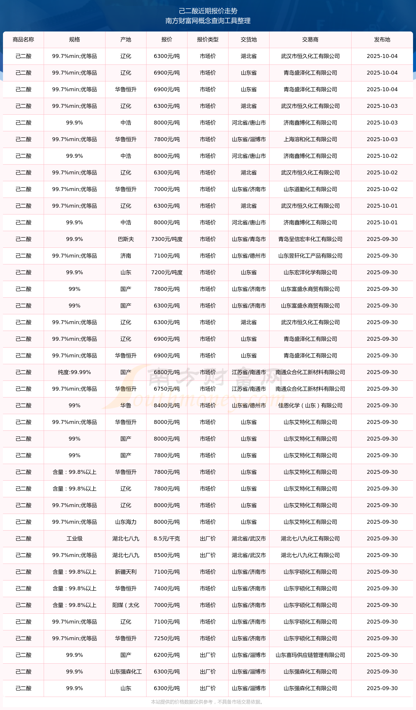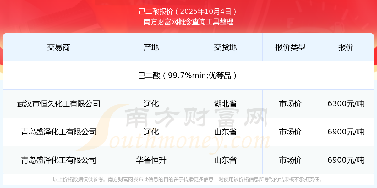 2025年10月4日,青島盛澤化工有限公司己二酸(99.7%min;優(yōu)等品),華魯恒升,交易地點為山東省,報價為6900.00元/噸。