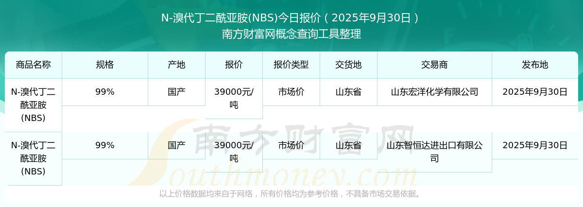 2025年9月30日,山東智恒達(dá)進(jìn)出口有限公司N-溴代丁二酰亞胺(NBS)(99%),國(guó)產(chǎn),交易地點(diǎn)為山東省,市場(chǎng)價(jià)報(bào)價(jià)為39000.00元/噸。