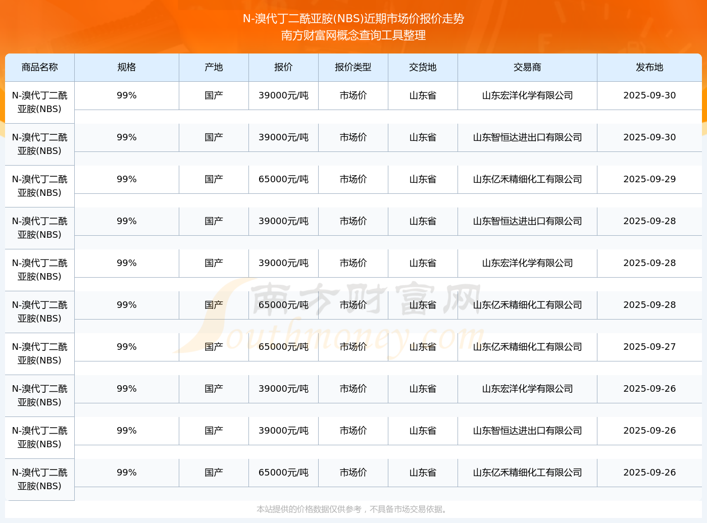 2025年9月30日N-溴代丁二酰亞胺(NBS)市場(chǎng)價(jià)報(bào)價(jià)動(dòng)態(tài)及近期市場(chǎng)價(jià)報(bào)價(jià)走勢(shì)