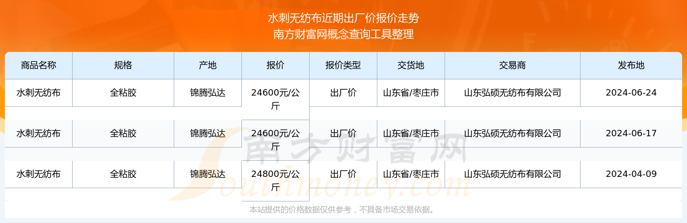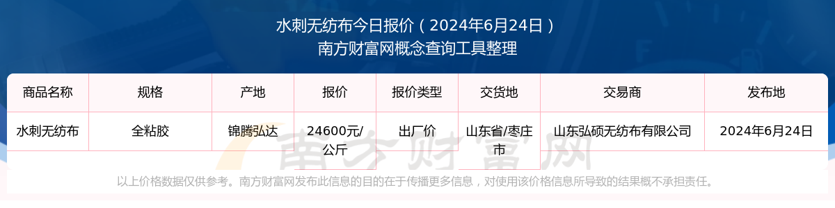 2024年6月24日,水刺無紡布(全粘膠)出廠價價格為24600.00元/公斤,報價人:山東弘碩無紡布有限公司,交易地點為山東省/棗莊市。