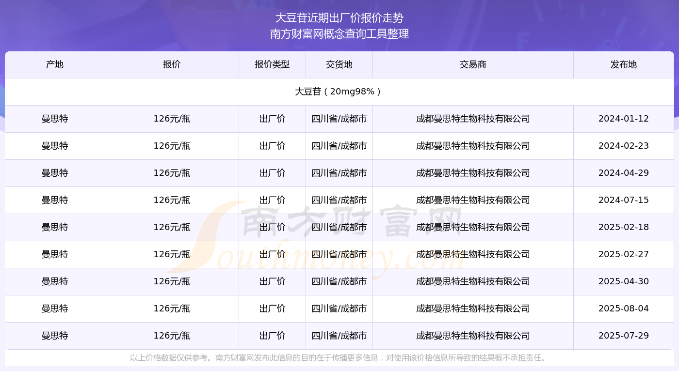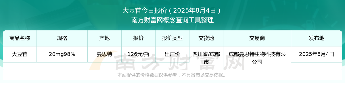 2025年8月4日,成都曼思特生物科技有限公司大豆苷(20mg98%),曼思特,交易地點(diǎn)為四川省/成都市,出廠價(jià)報(bào)價(jià)為126.00元/瓶。