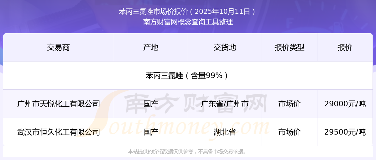 2025年10月11日,廣州市天悅化工有限公司苯丙三氮唑(含量99%),國產(chǎn),交易地點為廣東省/廣州市,市場價報價為29000.00元/噸。