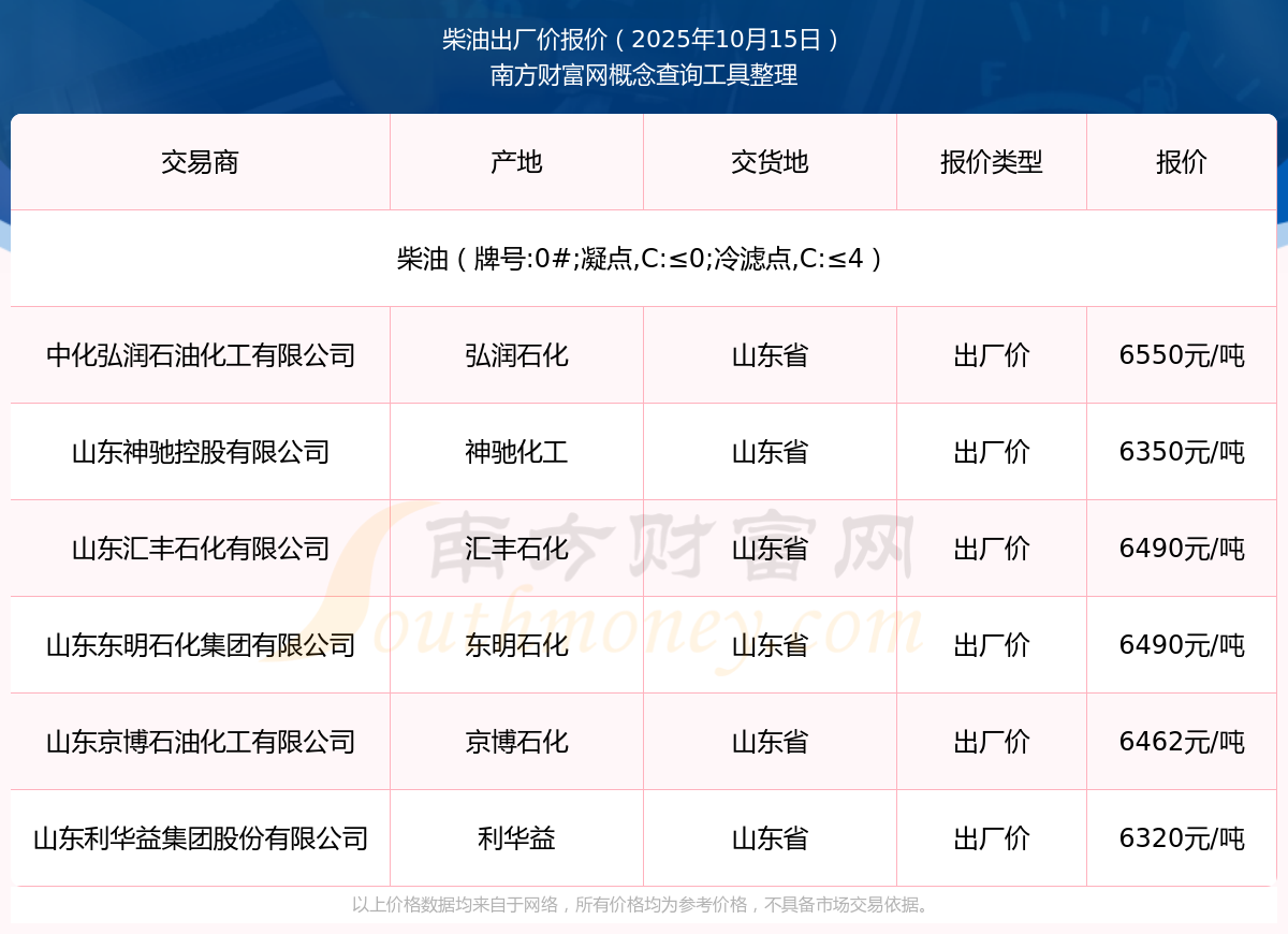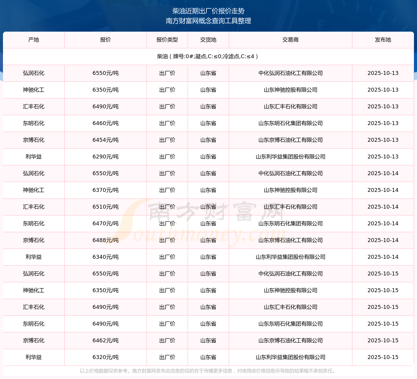 2025年10月15日,柴油(牌號:0#;凝點,C:≤0;冷濾點,C:≤4)出廠價價格為6550.00元/噸,報價人:中化弘潤石油化工有限公司,交易地點為山東省。