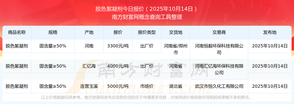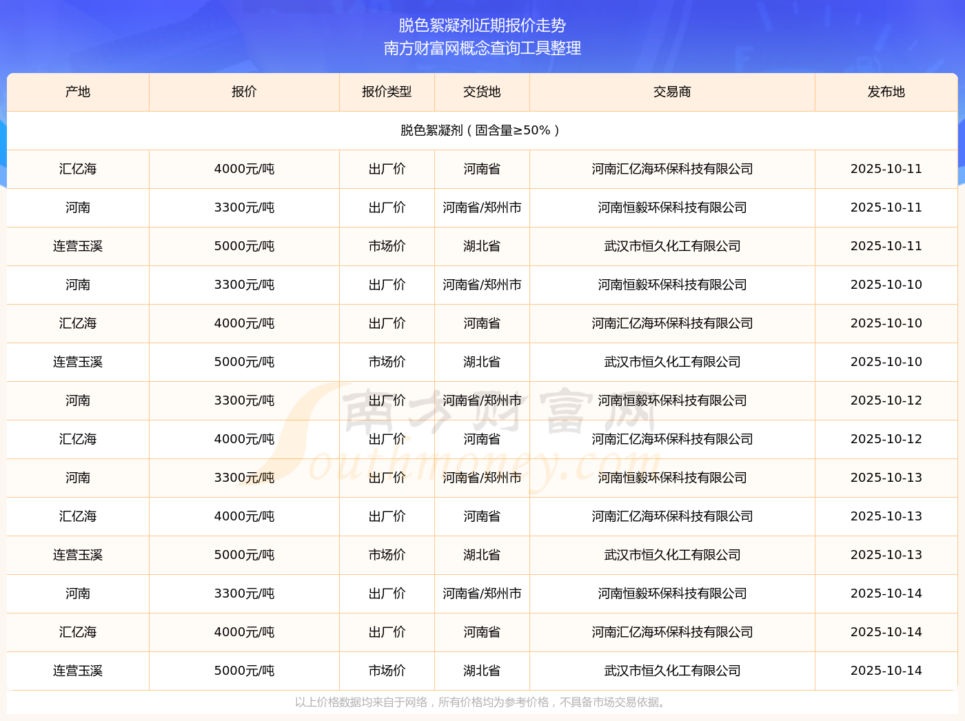 2025年10月14日,脫色絮凝劑(固含量≥50%)價格為4000.00元/噸,報價人:河南匯億海環(huán)?萍加邢薰,交易地點為河南省。