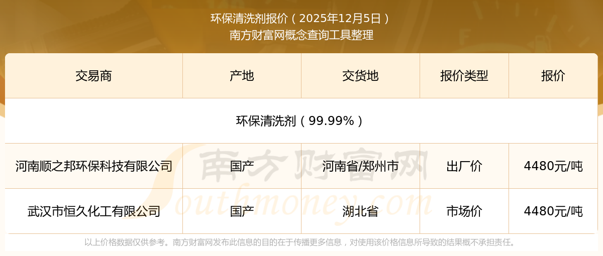 2025年12月5日,環(huán)保清洗劑(99.99%)價(jià)格為4480.00元/噸,報(bào)價(jià)人:武漢市恒久化工有限公司,交易地點(diǎn)為湖北省。