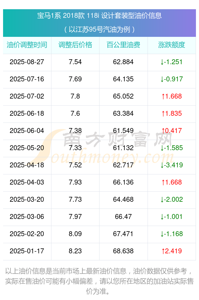 寶馬1系 2018款 118i 設(shè)計(jì)套裝型汽車油耗信息,9月5日92、95號(hào)汽油價(jià)格一覽表