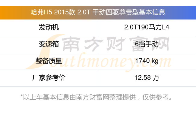 哈弗H5 2015款 2.0T 手動四驅(qū)尊貴型搭載了一臺2.0T190馬力L4渦輪增壓發(fā)動機,采用6擋手動擋變速箱,常規(guī)整備質(zhì)量1740kg,廠家參考價12.58萬元。