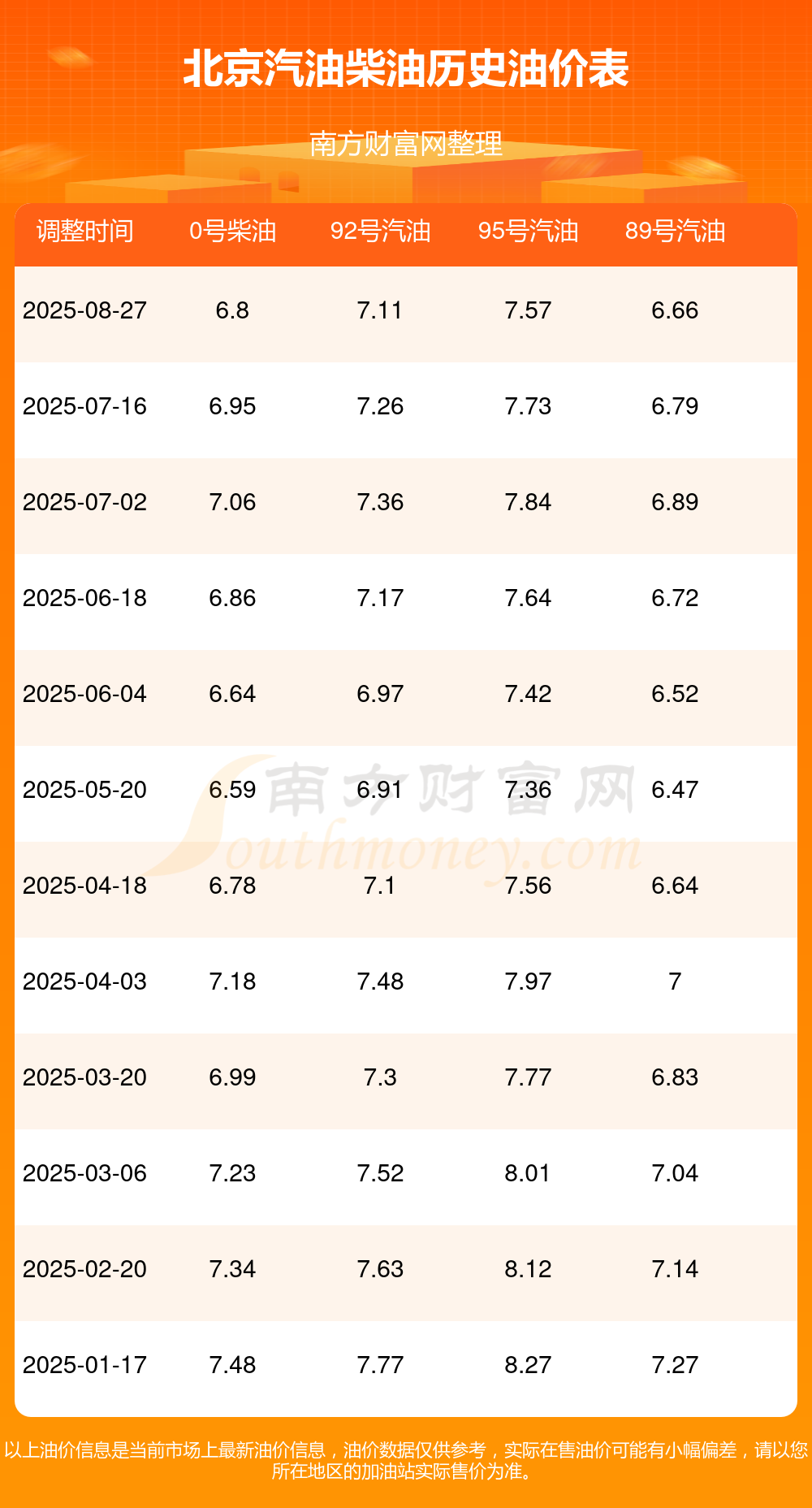 9月30日,北京汽油、柴油價(jià)格多少錢一升?具體為:8月27日調(diào)整后,92號(hào)汽油為7.11元,減了0.15元,減幅達(dá)2.07%;95號(hào)汽油為7.57元,減了0.16元,減幅達(dá)2.07%;89號(hào)汽油為6.66元,減了0.13元,減幅達(dá)1.92%;0號(hào)柴油為6.8元,減了0.15元,減幅達(dá)2.16%。