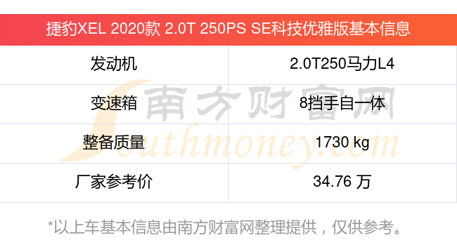 捷豹XEL 2020款 2.0T 250PS SE科技優(yōu)雅版動(dòng)力上配備的是一臺(tái)2.0T250馬力L4渦輪增壓發(fā)動(dòng)機(jī),匹配的是8擋手自一體自動(dòng)檔變速箱,燃料形式為汽油,常規(guī)整備質(zhì)量1730kg,廠家參考價(jià)34.76萬(wàn)元。