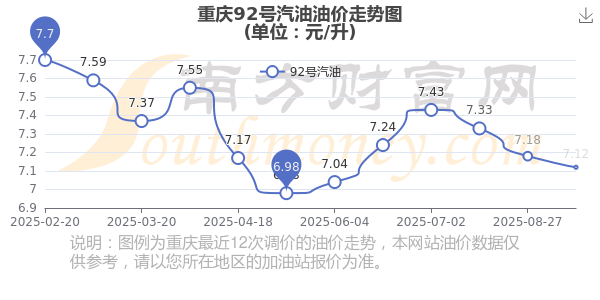 10月17日,重慶92號汽油的價格是7.12元每升,本次的調(diào)整時間為10月14日,對比上次的調(diào)整下降了0.06元,下降0.836%,下次調(diào)整時間為10月27日24時,還有10.96天。