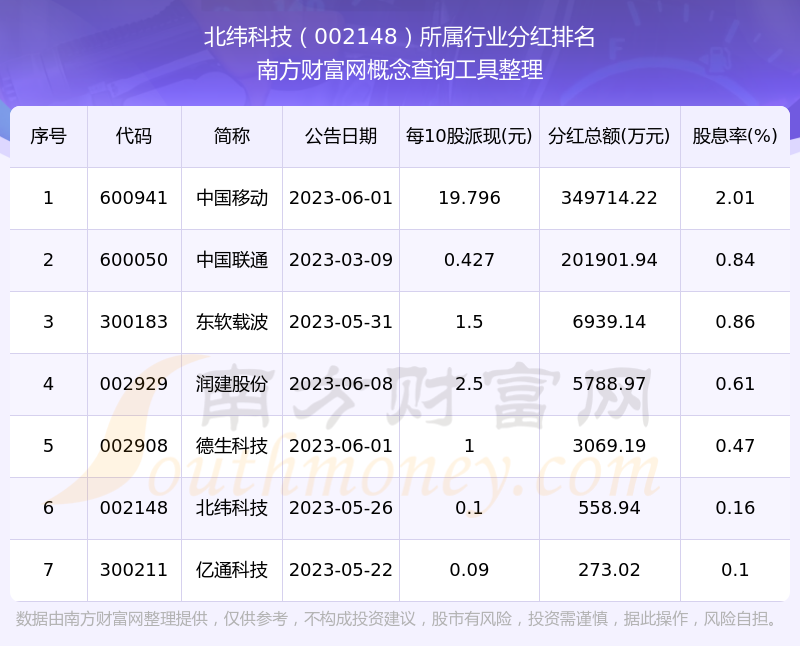 按照南方財(cái)富網(wǎng)趨勢(shì)選股系統(tǒng)統(tǒng)計(jì),北緯科技所屬行業(yè)為通信服務(wù)行業(yè),通信服務(wù)行業(yè)分紅排名情況如下表: