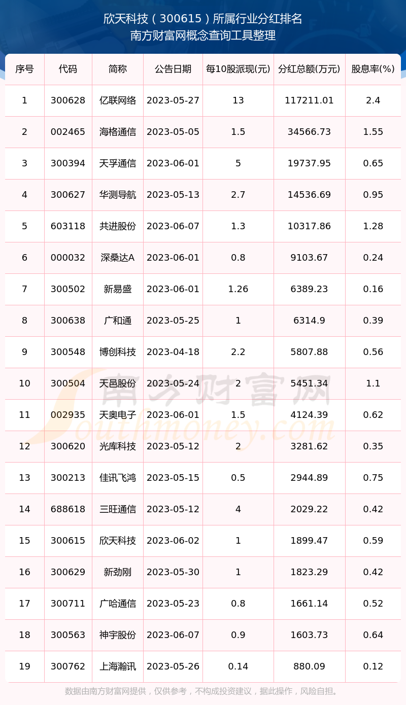 按照南方財(cái)富網(wǎng)趨勢(shì)選股系統(tǒng)統(tǒng)計(jì),欣天科技所屬行業(yè)為射頻器件行業(yè),射頻器件行業(yè)分紅排名情況如下表: