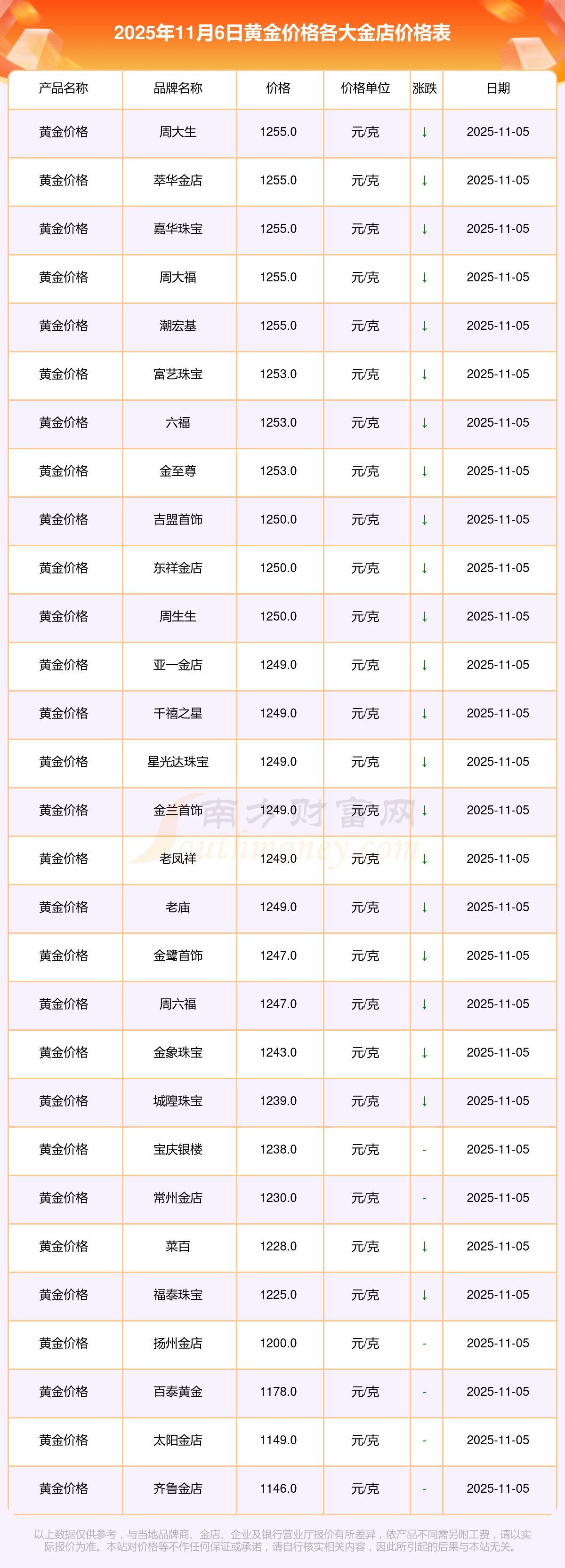 2025年11月6日潮宏基、周大生、周大生、亞一金店、亞一金店、寶慶銀樓、寶慶銀樓、太陽金店、太陽金店、齊魯金店、齊魯金店等各大金店品牌黃金價格最新價格如下:潮宏基鉑金價格616.0元/克,周大生黃金價格1255.0元/克,周大生鉑金價格616.0元/克,亞一金店黃金價格1249.0元/克,亞一金店鉑金價格560.0元/克,寶慶銀樓黃金價格1238.0元/克,寶慶銀樓鉑金價格368.0元/克,太陽金店黃金價格1149.0元/克,太陽金店鉑金價格489.0元/克,齊魯金店黃金價格1146.0元/克,齊魯金店鉑金價格559.0元/克。