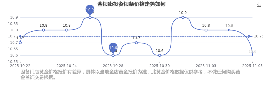 金銀街今日投資銀條的最新標價為10.6元/克。