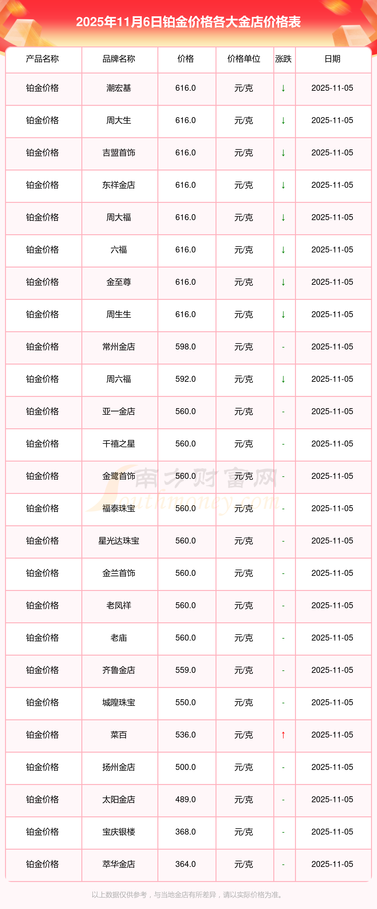 2025年11月6日潮宏基、周大生、周大生、亞一金店、亞一金店、寶慶銀樓、寶慶銀樓、太陽金店、太陽金店、齊魯金店、齊魯金店等各大金店品牌鉑金價格最新價格如下:潮宏基鉑金價格616.0元/克,周大生黃金價格1255.0元/克,周大生鉑金價格616.0元/克,亞一金店黃金價格1249.0元/克,亞一金店鉑金價格560.0元/克,寶慶銀樓黃金價格1238.0元/克,寶慶銀樓鉑金價格368.0元/克,太陽金店黃金價格1149.0元/克,太陽金店鉑金價格489.0元/克,齊魯金店黃金價格1146.0元/克,齊魯金店鉑金價格559.0元/克。