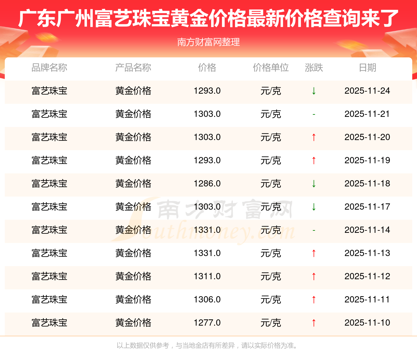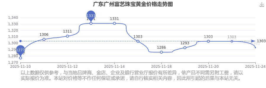 今日(2025年11月24日)廣東廣州富藝珠寶黃金價(jià)格是1293.0元/克。