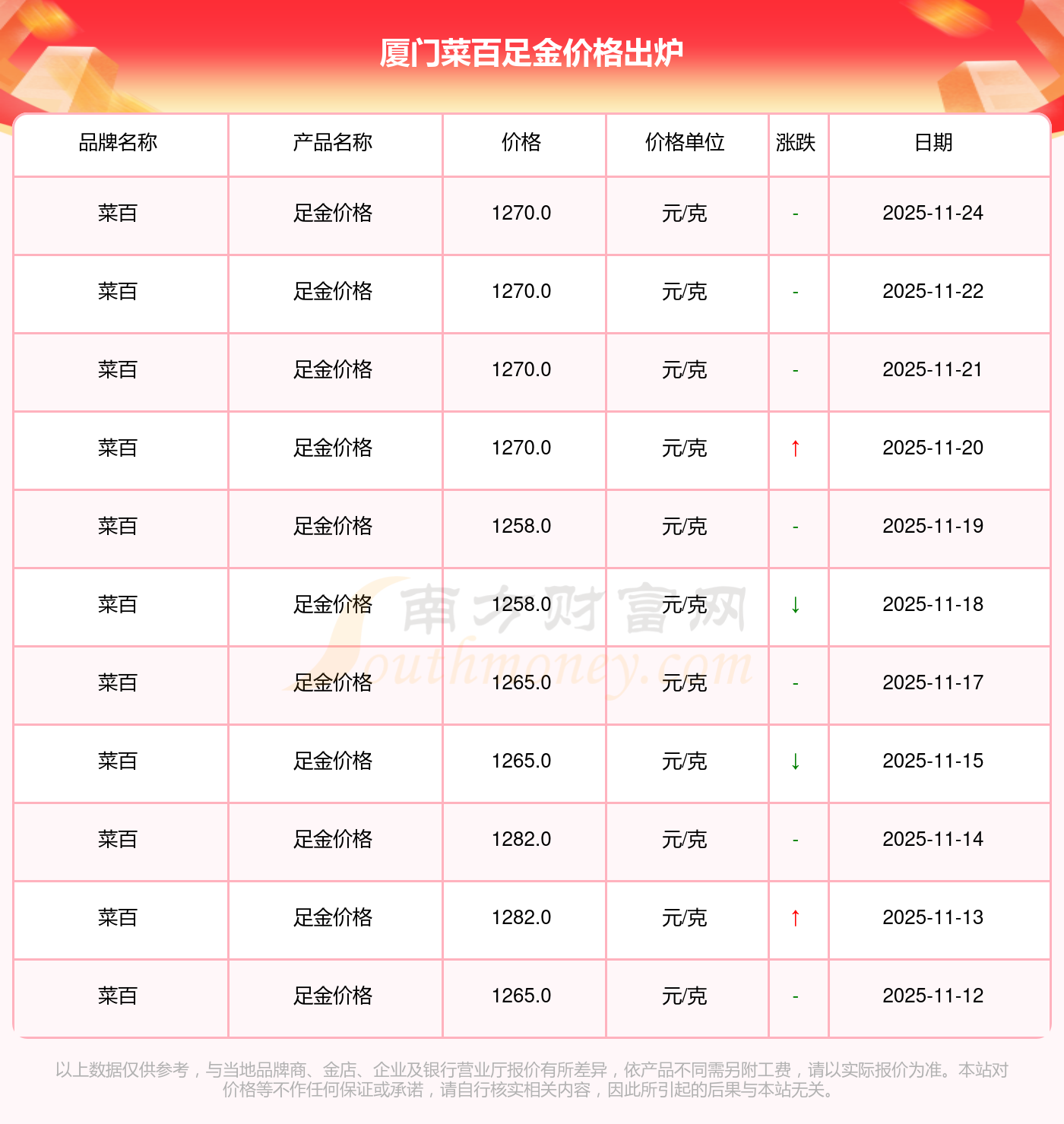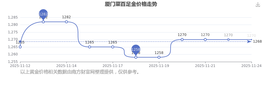 2025年11月24日,今日廈門菜百足金價格:1270.0元/克。