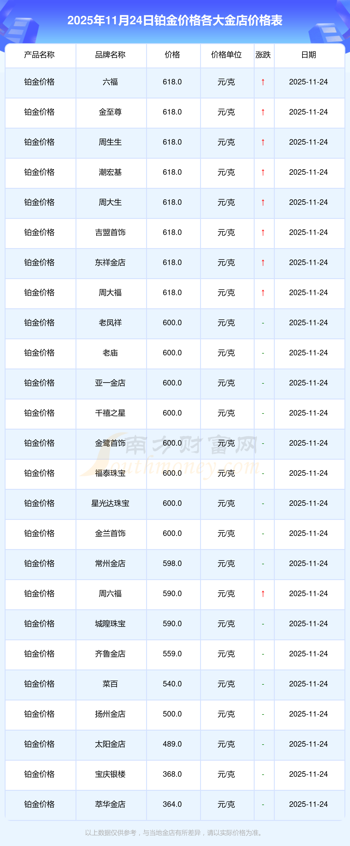 2025年11月24日,周大福、周大福、周大福、老鳳祥、老鳳祥、老鳳祥、周六福、周六福、周六福、周六福、六福等各大金店品牌鉑金價(jià)格今日價(jià)格如下:周大福17630.0、周大福40570.0、周大福1134.0元/克、老鳳祥1295.0元/克、老鳳祥600.0元/克、老鳳祥1295.0元/克、周六福1259.0元/克、周六福590.0元/克、周六福590.0元/克、周六福1154.0元/克、六福1293.0元/克。