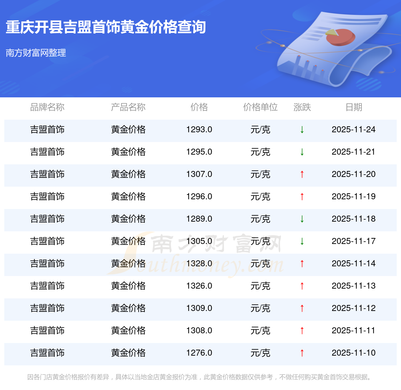 當(dāng)下一克黃金售價幾何?今日重慶開縣吉盟首飾黃金價格查詢,今日(2025年11月24日),重慶開縣吉盟首飾黃金價格每克的價值為1293.0元/克。