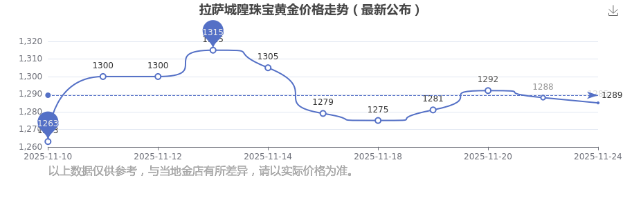 (2025年11月24日)拉薩城隍珠寶黃金價(jià)格現(xiàn)在為1285.0元/克。