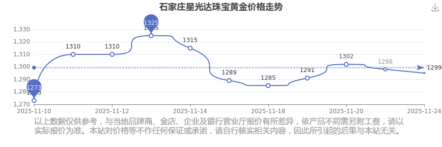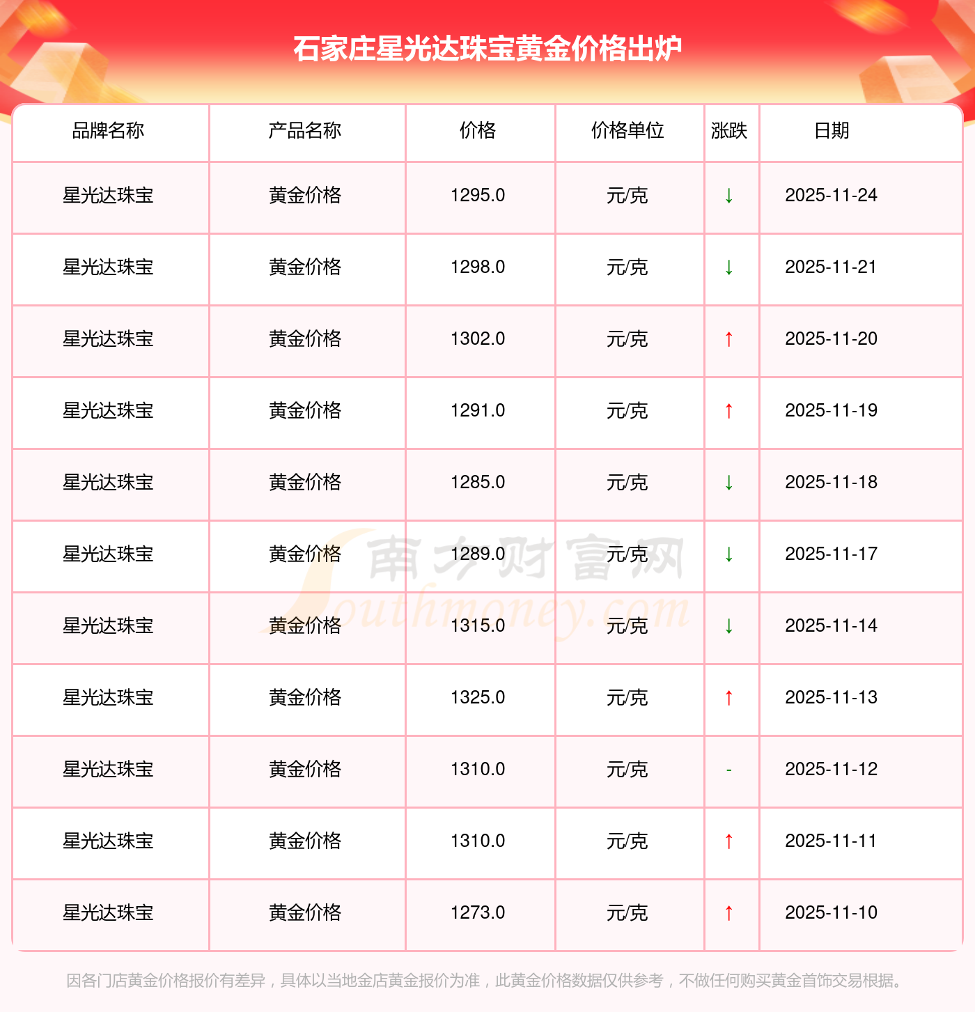 石家莊星光達珠寶在 2025年11月24日的黃金價格零售價格為 1295.0元/克。