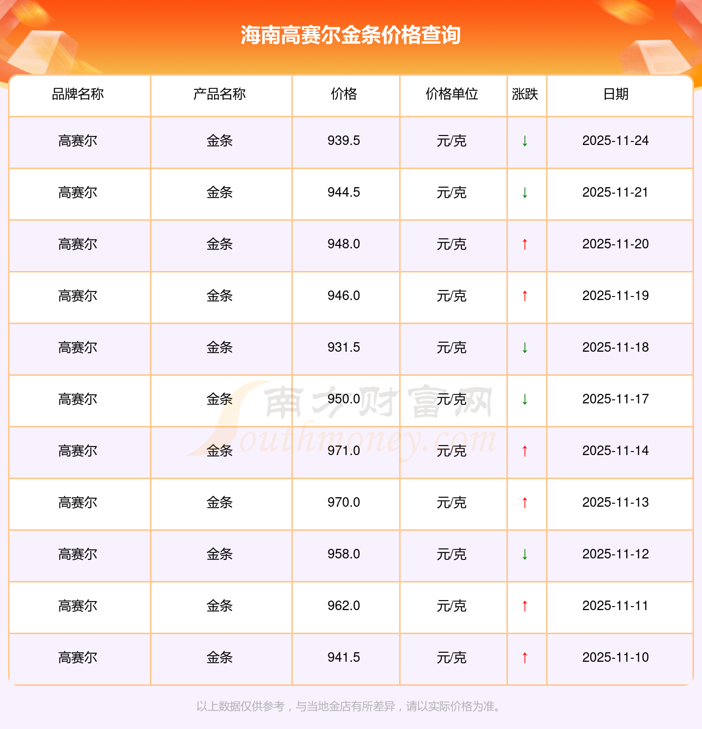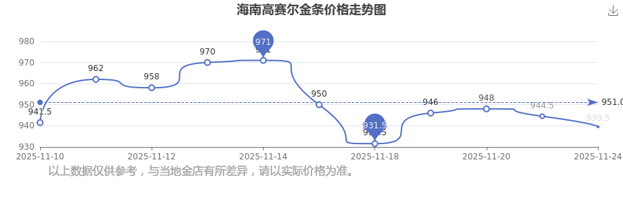 今日(2025年11月24日),海南高賽爾金條價格:939.5元/克。
