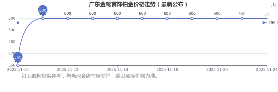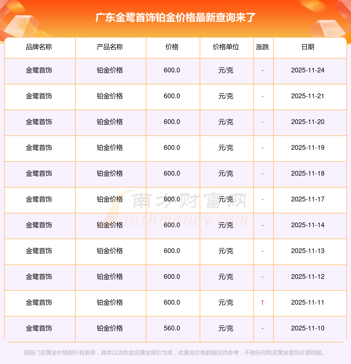 2025年11月24日廣東金鷺首飾鉑金價格為600.0元/克。