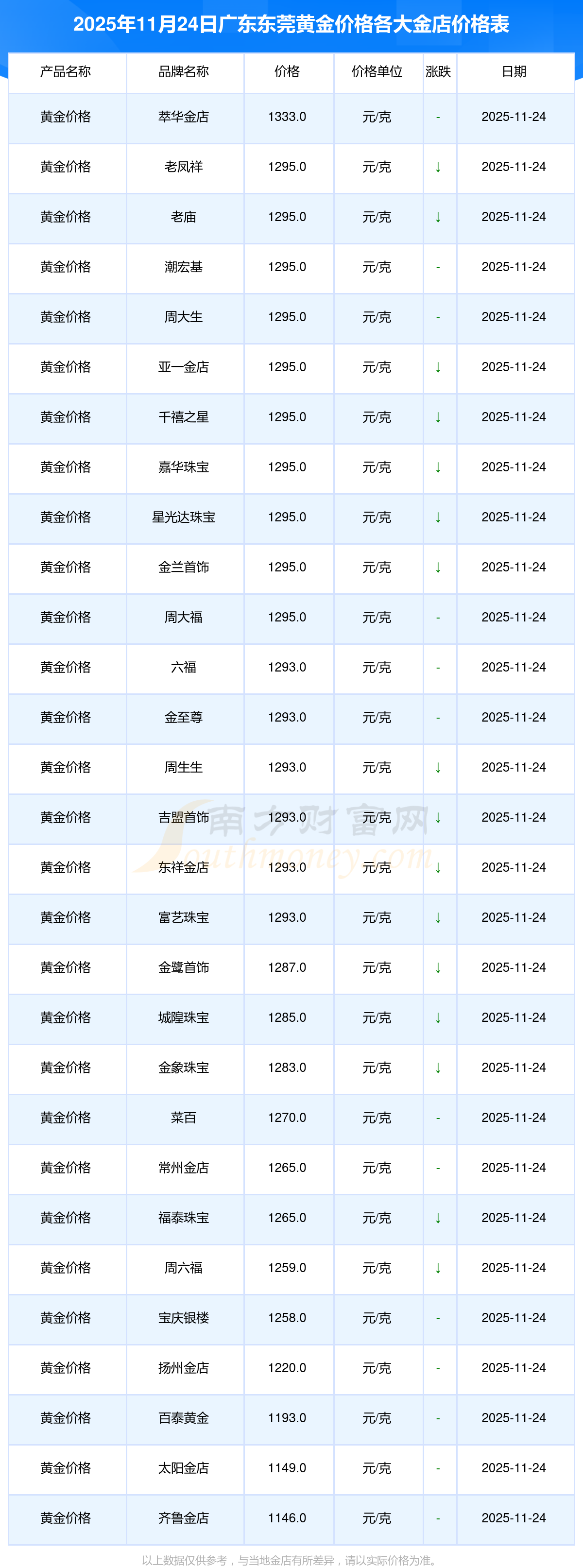 2025年11月24日廣東東莞周大福、周大福、周大福、老鳳祥、老鳳祥、老鳳祥、周六福、周六福、周六福、周六福、六福等各大金店品牌黃金價(jià)格最新價(jià)格行情來(lái)了,如下:周大福鉑金價(jià)格(香港)17630.0,周大福金條價(jià)格(香港)40570.0,周大福金條金價(jià)(內(nèi)地)1134.0元/克,老鳳祥黃金價(jià)格1295.0元/克,老鳳祥鉑金價(jià)格600.0元/克,老鳳祥足金價(jià)格1295.0元/克,周六福黃金價(jià)格1259.0元/克,周六福鉑金價(jià)格590.0元/克,周六福PT999鉑金價(jià)格590.0元/克,周六福金條價(jià)格1154.0元/克,六福黃金價(jià)格1293.0元/克。