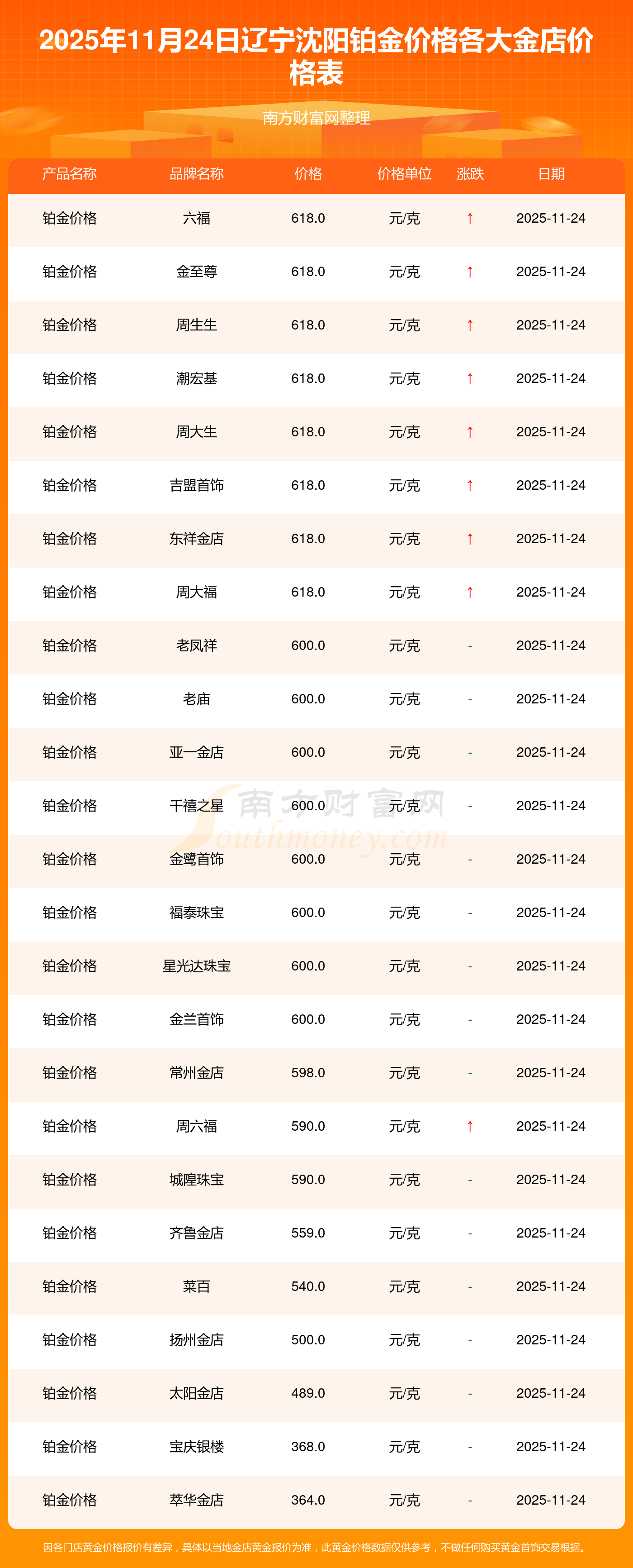 一、2025年11月24日遼寧沈陽各大金店鉑金價格是多少錢一克?