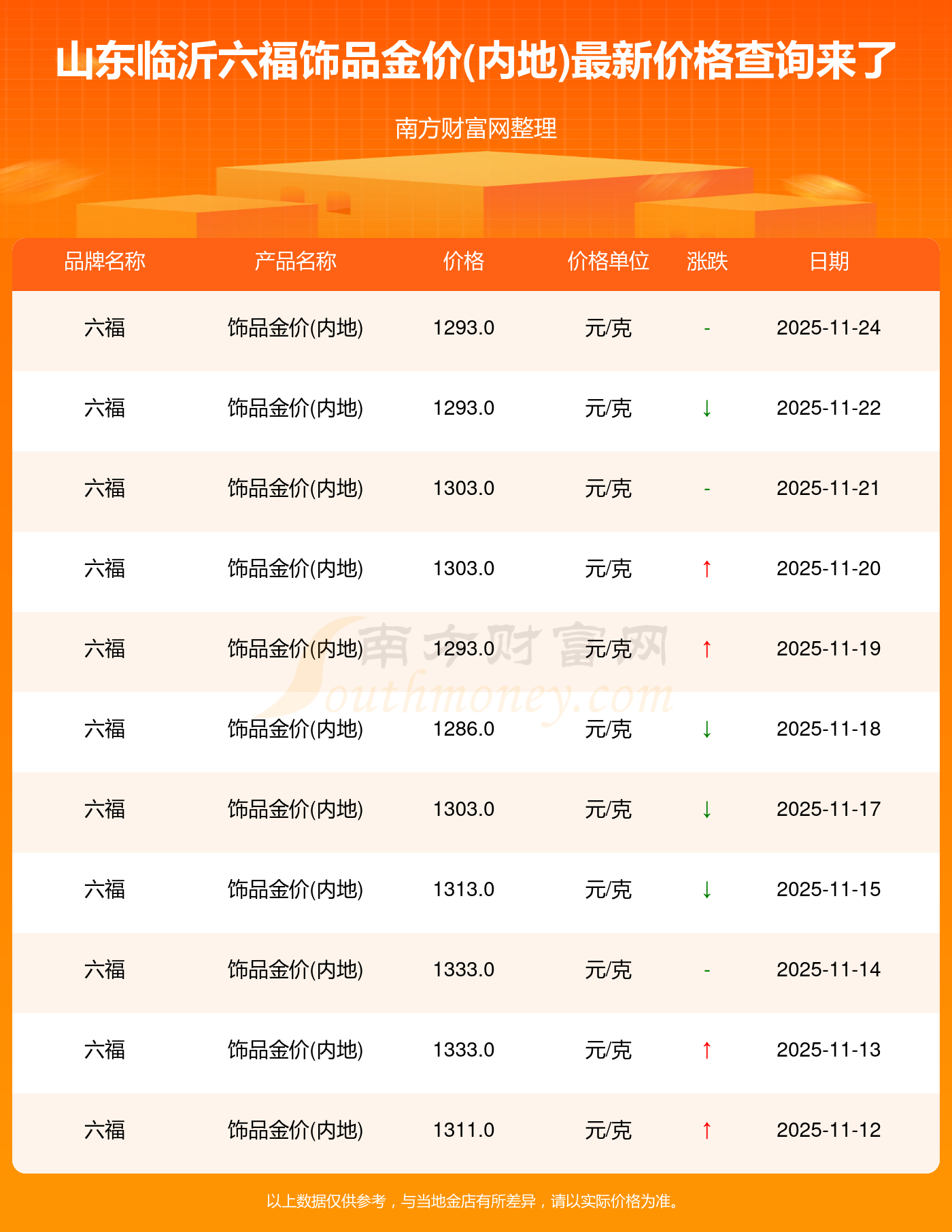 今天是2025年11月24日,周大福、周大福、周大福、老鳳祥、老鳳祥、老鳳祥、周六福、周六福、周六福、周六福、六福等各大金店品牌飾品金價(jià)(內(nèi)地)最新價(jià)格如下:周大福17630.0、周大福40570.0、周大福1134.0元/克、老鳳祥1295.0元/克、老鳳祥600.0元/克、老鳳祥1295.0元/克、周六福1259.0元/克、周六福590.0元/克、周六福590.0元/克、周六福1154.0元/克、六福1293.0元/克。