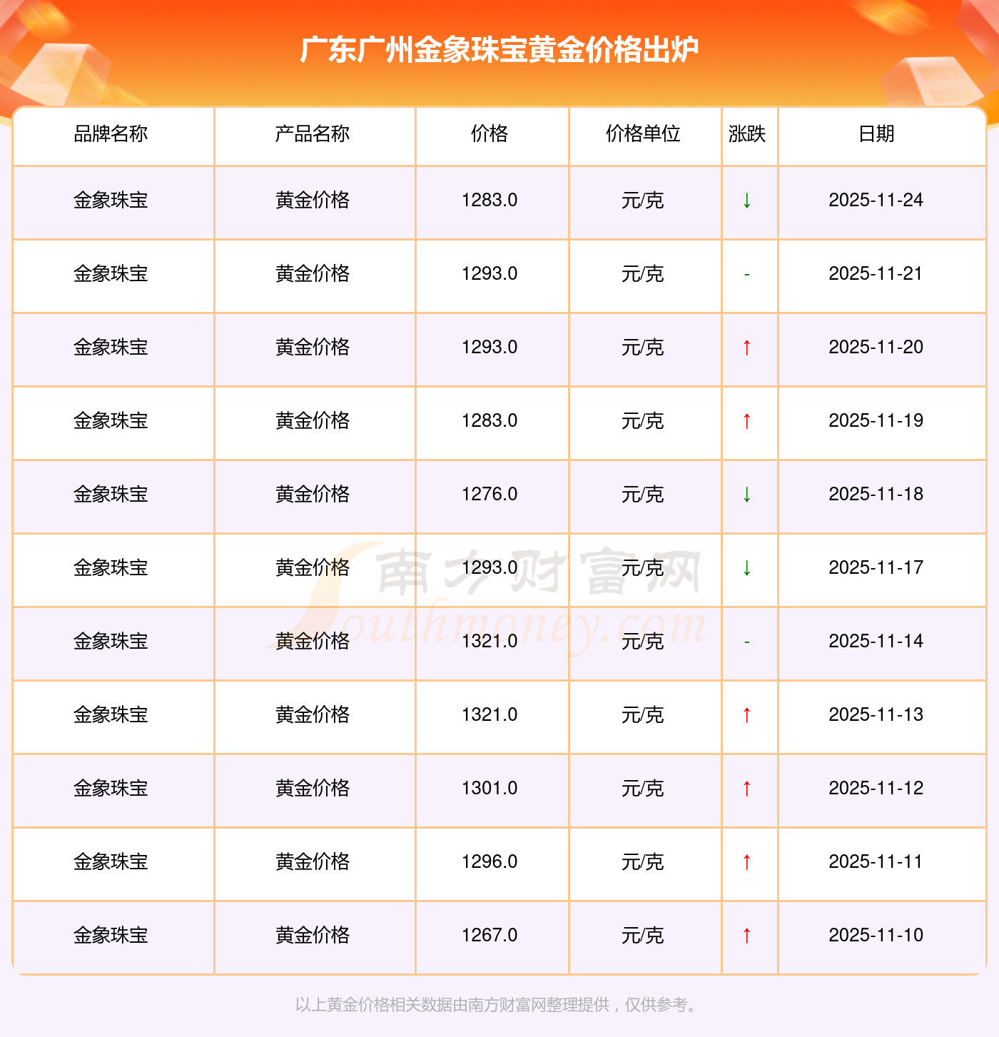 2025年11月24日,廣東廣州金象珠寶的黃金價格標價達到 1283.0元/克。