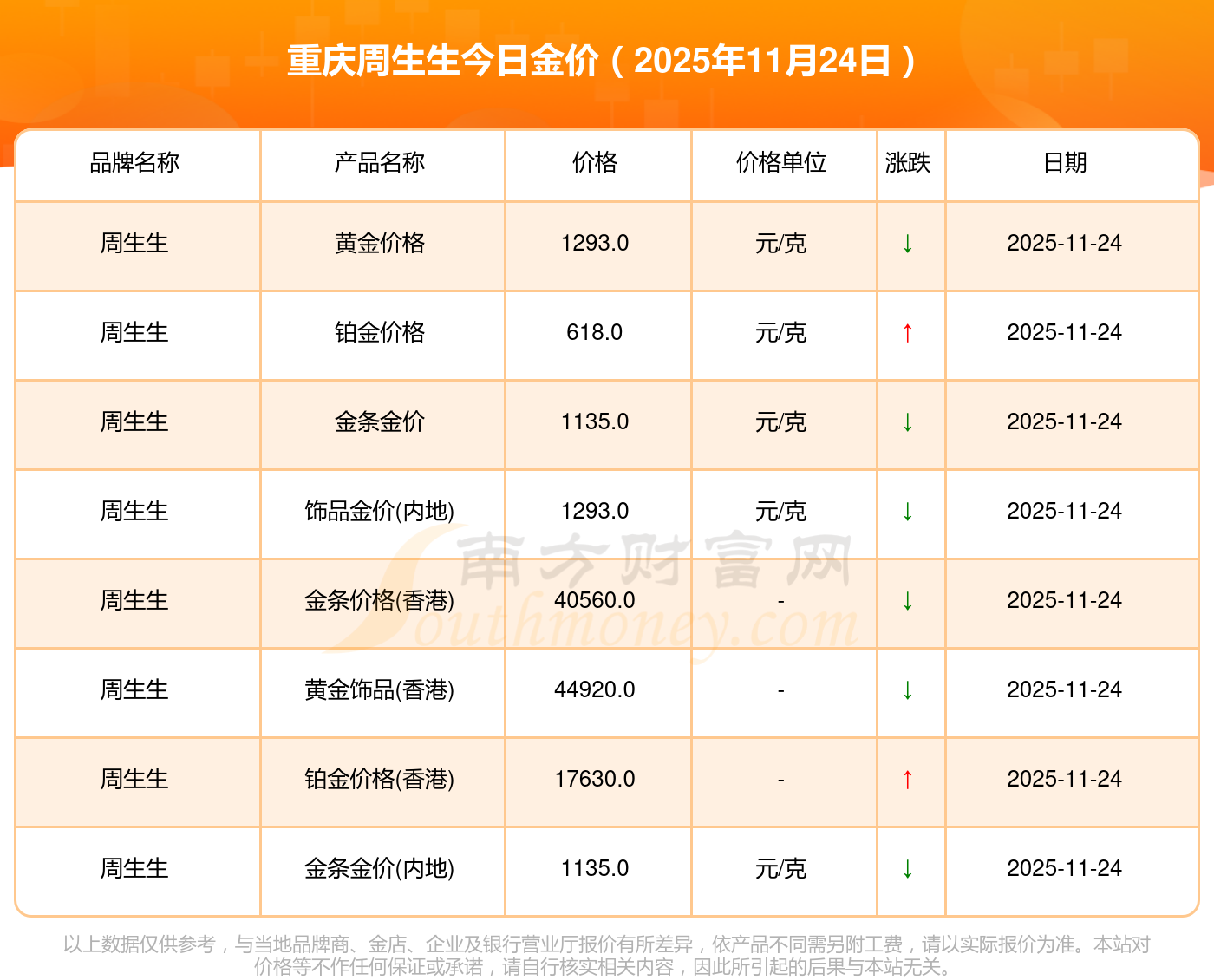 想了解此刻黃金價格,今天黃金一克的售價為多少?2025年11月24日重慶周生生最新價格:鉑金價格(香港)17630.0,金條價格(香港)40570.0,金條金價(內(nèi)地)1134.0元/克,黃金價格1295.0元/克,鉑金價格600.0元/克,足金價格1295.0元/克,黃金價格1259.0元/克,鉑金價格590.0元/克,PT999鉑金價格590.0元/克,金條價格1154.0元/克,黃金價格1293.0元/克。