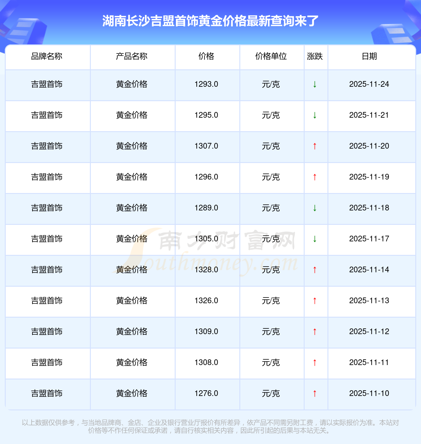 以上數(shù)據(jù)僅供參考,與當(dāng)?shù)仄放粕、金店、企業(yè)及銀行營(yíng)業(yè)廳報(bào)價(jià)有所差異,依產(chǎn)品不同需另附工費(fèi),請(qǐng)以實(shí)際報(bào)價(jià)為準(zhǔn)。本站對(duì)價(jià)格等不作任何保證或承諾,請(qǐng)自行核實(shí)相關(guān)內(nèi)容,因此所引起的后果與本站無(wú)關(guān)。