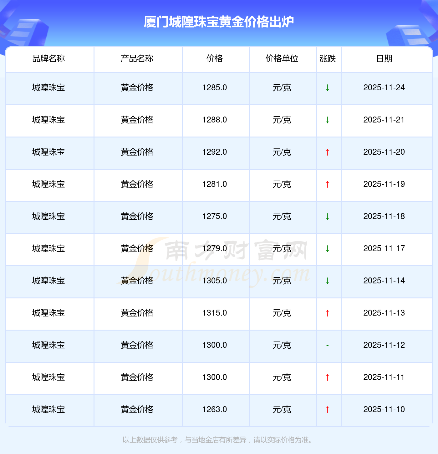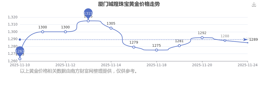 今日(2025年11月24日)廈門城隍珠寶黃金價(jià)格最新價(jià)格為1285.0元/克。