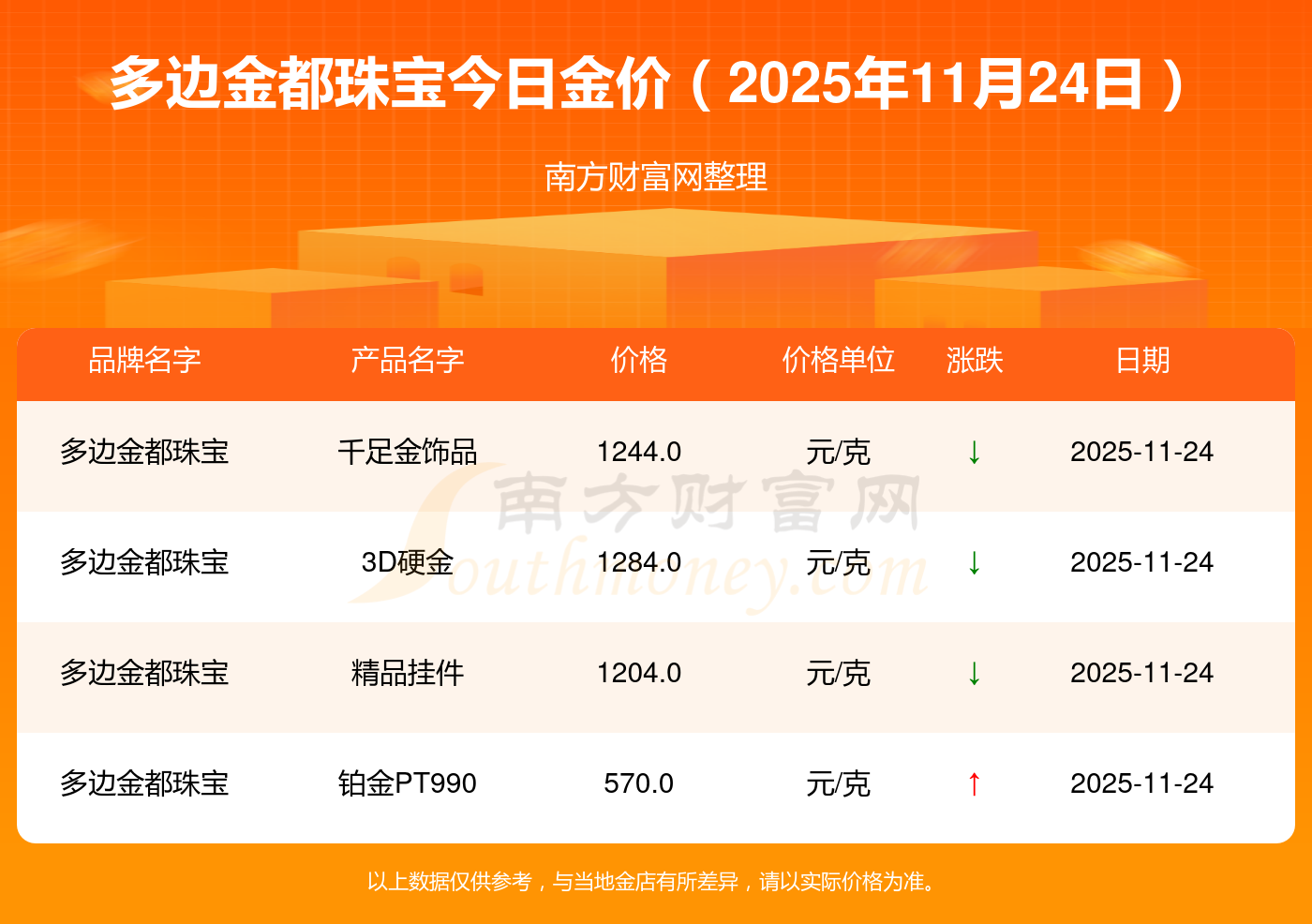 現(xiàn)在多邊金都珠寶黃金價格是多少錢1克_2025年多邊金都珠寶今日金價是多少錢一克,最新多邊金都珠寶查詢,2025年11月24日多邊金都珠寶鉑金PT990現(xiàn)在每克多少錢?最新多邊金都珠寶鉑金PT990報價公布,一起來看看吧!